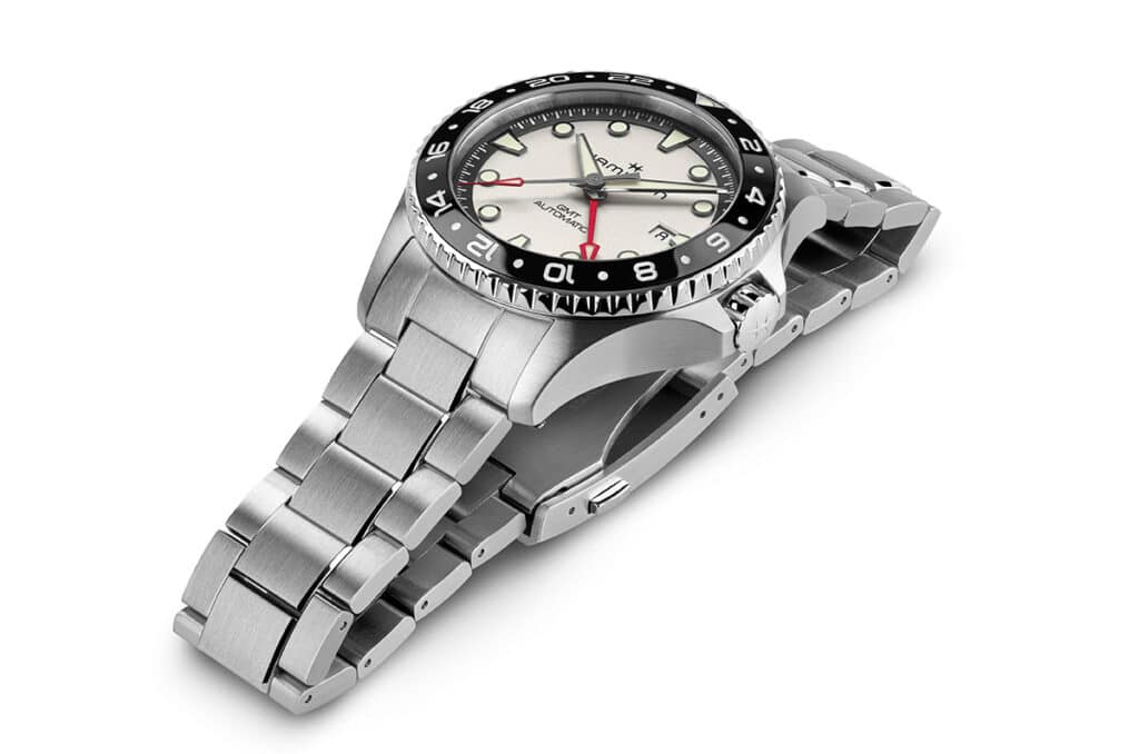 La colección Khaki Navy de Hamilton anuncia una importante novedad. Ahora incorpora la función GMT, ideal para los amantes de los viajes y los más aventureros, ya que permite llevar un control de tiempo sin interrupciones a través de múltiples husos horarios. Está pensada especialmente para el mundo náutico, cumpliendo con todo lo necesario para llevar a cabo exploraciones oceánicas.