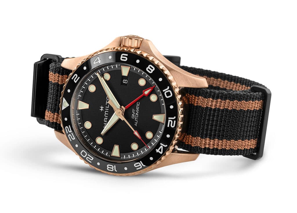 El nuevo Khaki Navy GMT se presenta en dos versiones. La primera tiene una caja de acero inoxidable con brazalete cepillado y una esfera blanca texturizada, realzada por toques de Super-LumiNova® verde claro que garantizan una legibilidad óptima. La segunda edición destaca con una caja de bronce, esfera negra y los mismos acentos luminiscentes, acompañada por una correa NATO negra con detalles dorados que le da un aire robusto pero sofisticado.