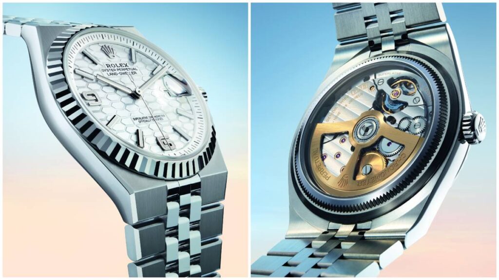 Con nombre propio: Oyster Perpetual Land Dweller, una creación que se distingue por su audacia estética –destaca la esfera con motivo ‘nido de abeja’– y técnica. Propuesto en dos tamaños –36 mm y 40 mm–, atesora 32 patentes y solicitudes de patente en su haber de ellas 18 son exclusivas de este reloj y 16 tienen que ver con el nuevo movimiento–. En su interior se halla el calibre 7135, un movimiento con una frecuencia de 5 hercios, más delgado que la mayoría de los movimientos Rolex, pero con unas prestaciones extraordinarias gracias a un sistema de regulación compuesto por un nuevo escape, el Dynapulse, y un oscilador de última generación.