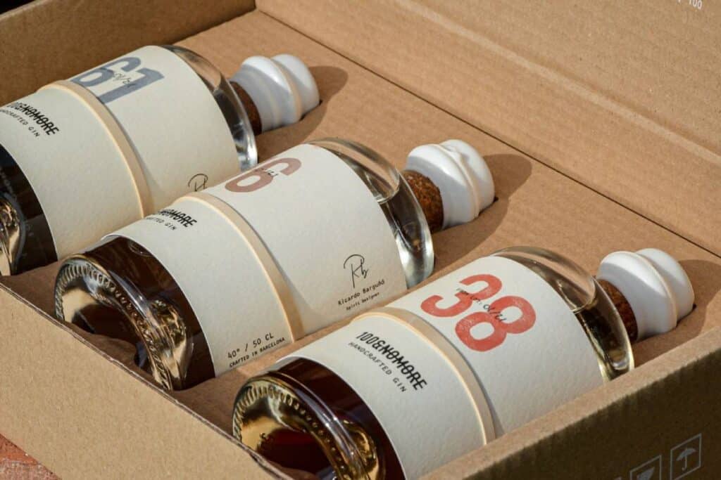 El packaging juega un papel clave, especialmente para los clientes que no nos conocen, ya que no pueden probar el producto hasta que lo compran. Es por ello que el envase tiene que ser un reflejo del contenido y de la filosofía de la marca. Se trata de un packaging sencillo y elegante, en el que el principal atributo es el número de un color determinado, que indican la receta (color) y el número de botella (del 1 al 100). Que la etiqueta no vaya enganchada y sujeta con una goma, también es un hecho diferencial, y permite leer la parte posterior de la etiqueta con la historia de cada receta. Nuestros clientes no compran únicamente una ginebra, sino una experiencia. Cuando abren la botella con sus amigos, comparten la historia de la marca y qué hace especial esa ginebra que están bebiendo, haciéndoles aparcar el estrés y disfrutar del momento.