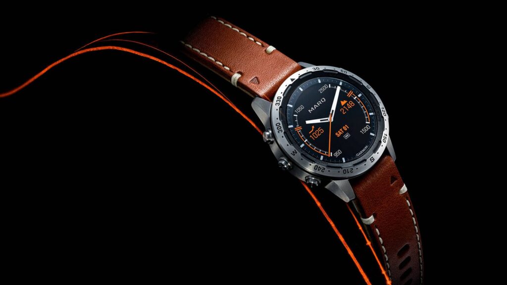 MARQ Aviator. Inspirado en la aviación, MARQ Aviator es el reloj que soñaban todos los amantes de la aeronáutica. Un reloj premium con un estilo clásico diseñado en titanio cepillado, con bisel GMT de cerámica negra pulida y brazalete de titanio que se adapta perfectamente a la muñeca gracias al diseño de tres eslabones y correcciones microscópicas, que lo convierten en la mejor herramienta de vuelo o en un reloj de diseño exclusivo fuera de la cabina. MARQ Aviator también destaca por ofrecer funciones específicas de aviación, como Direct-to-Navigation o Nexrad Weather Radar, una base de datos de aeropuertos de todo el mundo, así como conectividad con la cabina de Garmin.
